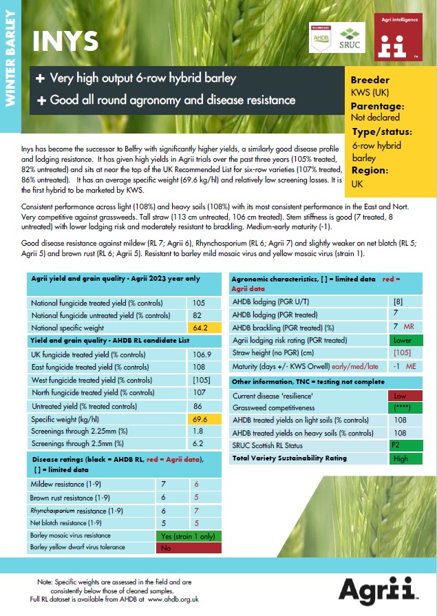 Inys has become the successor to Belfry with significantly higher yields, a similarly good disease profile and lodging resistance.