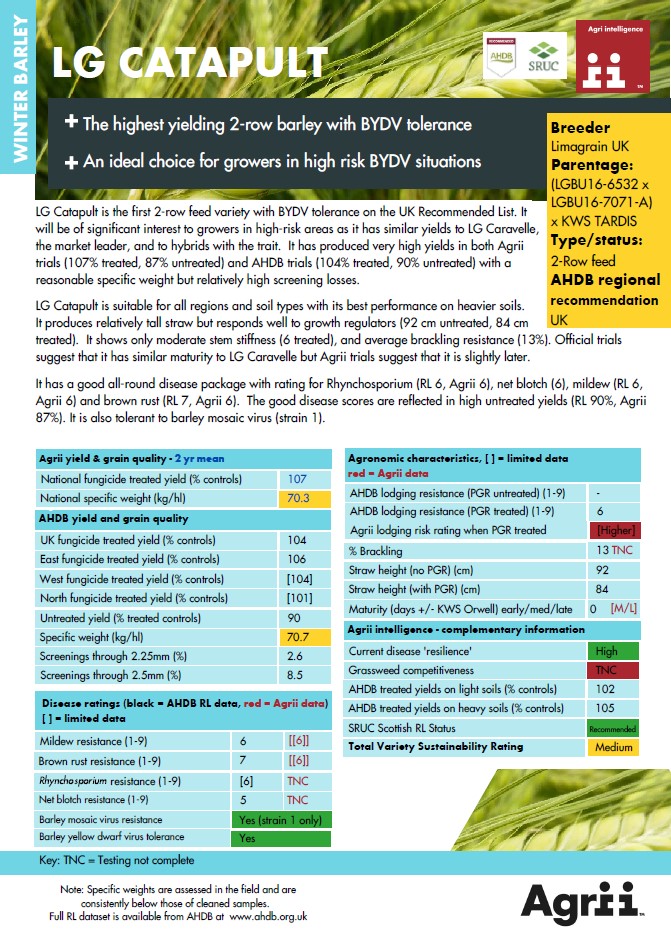 LG Catapult is the first 2-row feed variety with BYDV tolerance on the UK Recommended List.