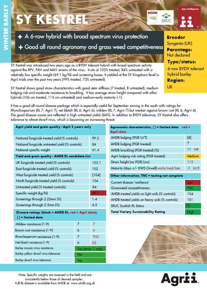In addition to BYDV tolerance, SY Kestrel also offers tolerance to wheat dwarf virus, which is becoming an increasing threat.