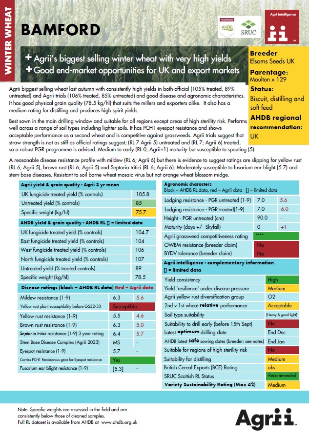 It has very high yields in both official (106% treated, 87% untreated) and Agrii trials over the past two years (107% treated, 81% untreated).